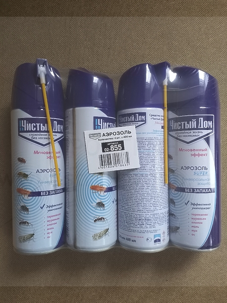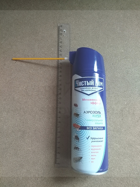 держа баллон вертикально, нажать на распылитель и с расстояния 20 см направить струю «Чистый Дом аэрозоль супер» в возможные места обитания, скопления и передвижения насекомых.